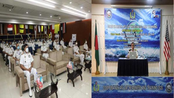 বাংলাদেশ নৌবাহিনী এবং যুক্তরাষ্ট্র নৌবাহিনীর মধ্যে অনুষ্ঠিত যৌথ সমুদ্র মহড়া ‘কো-অপারেশন এফ্লোট রেডিনেস অ্যান্ড ট্রেনিং ২০২০’-এর সমাপনী অনুষ্ঠান সোমবার চট্টগ্রামের বিএন ফ্লিট হেডকোয়ার্টার্সে অনুষ্ঠিত হয়েছে। আইএসপিআর এক সংবাদ বিজ্ঞপ্তিতে জানায়,