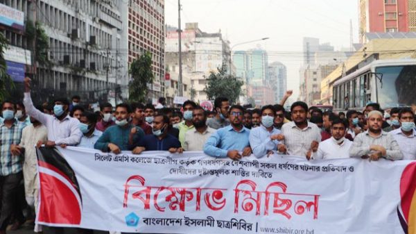 সিলেট এমসি কলেজের ছাত্রাবাসে ছাত্রলীগ সন্ত্রাসীদের মাধ্যমে স্বামীকে আটকে রেখে স্ত্রীকে গণধর্ষণের ঘটনার প্রতিবাদ ও অবিলম্বে জড়িতদের দৃষ্টান্তমূলক শাস্তির দাবিতে রাজধানীতে বিক্ষোভ মিছিল ও সমাবেশ করেছে বাংলাদেশ ইসলামী ছাত্রশিবির। মঙ্গলবার