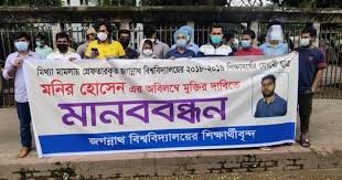 হত্যা মামলায় কারাগারে থাকা জগন্নাথ বিশ্ববিদ্যালয়ের ২০১৮-১৯ শিক্ষাবর্ষের হিসাববিজ্ঞান বিভাগের শিক্ষার্থী মনির হোসেনের নিঃশর্ত মুক্তি দাবি জানিয়েছে বিশ্ববিদ্যালয়ের সাধারণ শিক্ষার্থীরা। রবিবার সকাল সাড়ে ১০টায় জাতীয় প্রেসক্লাবের সামনে এক মানববন্ধন কর্মসূচির