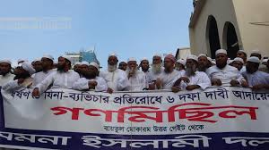 ধর্ষণ ও জেনা-ব্যাভিচার প্রতিরোধে ছয় দফা দাবি আদায়ে রাজধানীতে গণমিছিল করেছে সমমনা ইসলামীদলসমূহ। আজ শুক্রবার বাদ জুমা জাতীয় মসজিদ বায়তুল মোকাররমের উত্তর গেট থেকে মিছিল শুরু হয়ে বিজয়নগরে গিয়ে পুলিশি