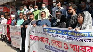 বরিশালে নদীভাঙনের হাত থেকে রক্ষা করার দাবিতে মানববন্ধন