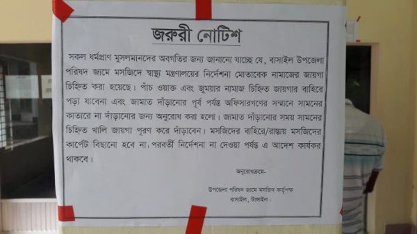 টাঙ্গাইলের বাসাইল উপজেলা পরিষদ জামে মসজিদের প্রথম কাতারে বসবেন অফিসাররা, অন্য কেউ বসতে পারবেন না। সম্প্রতি এ সংক্রান্ত একটি জরুরি নোটিশ স্বাস্থ্য মন্ত্রণালয়ের বরাদ দিয়ে মসজিদে প্রবেশের দরজাসহ বিভিন্ন জায়গায়